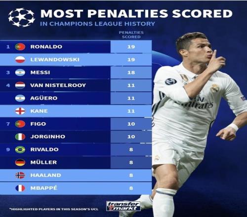 這份榜單最扎眼的是“點球占比”的排序:從高到低依次是——若日尼奧100%(9/9)、菲戈41.67%(10/24)、里瓦爾多29.63%(8/27)、阿圭羅26.83%(11/41)、凱恩26.19%(11/42)、范尼斯特爾魯伊19.64%(11/56)、萊萬18.10%(19/105)、哈蘭德16.33%(8/49)、穆勒14.04%(8/57)、姆巴佩14.04%(8/57)、梅西13.95%(18/129)、C羅13.57%(19/140)。按比例看,C羅不僅不“靠點球”,反而是這組頂級射手里點球占比最低的一個。